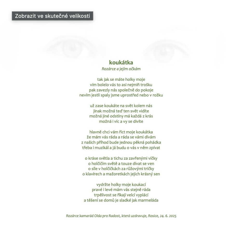 Přijeli jsme do malého kempu u přehrady. Za okénkem seděla na maminčině klíně pomocnice. Bytost plně zaujatá možností být součástí tvoření potvrzení o zaplacení vstupu.Přicházela slova pro tuto vílu. Když jsem začal psát, najednou jsem zjistil, že nepíšu pro ní, ale odrazy uvědomění, které skrze ní přišly, jsou ale určeny mně či dospělým obecně.Ponořil jsem se tedy znovu do obrazu téhle...
