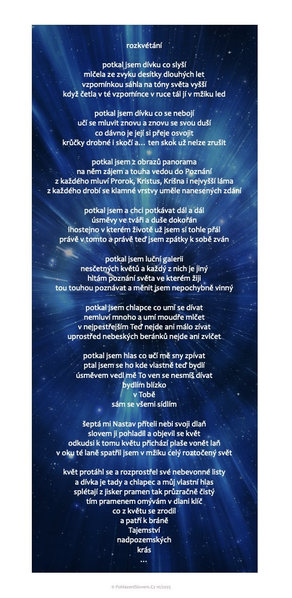 sklopím oči a na chvíli se ztratím tak ona v pokoře slova kreslí obraz duše přikrčená čeká až sebevědomí se vrátí...